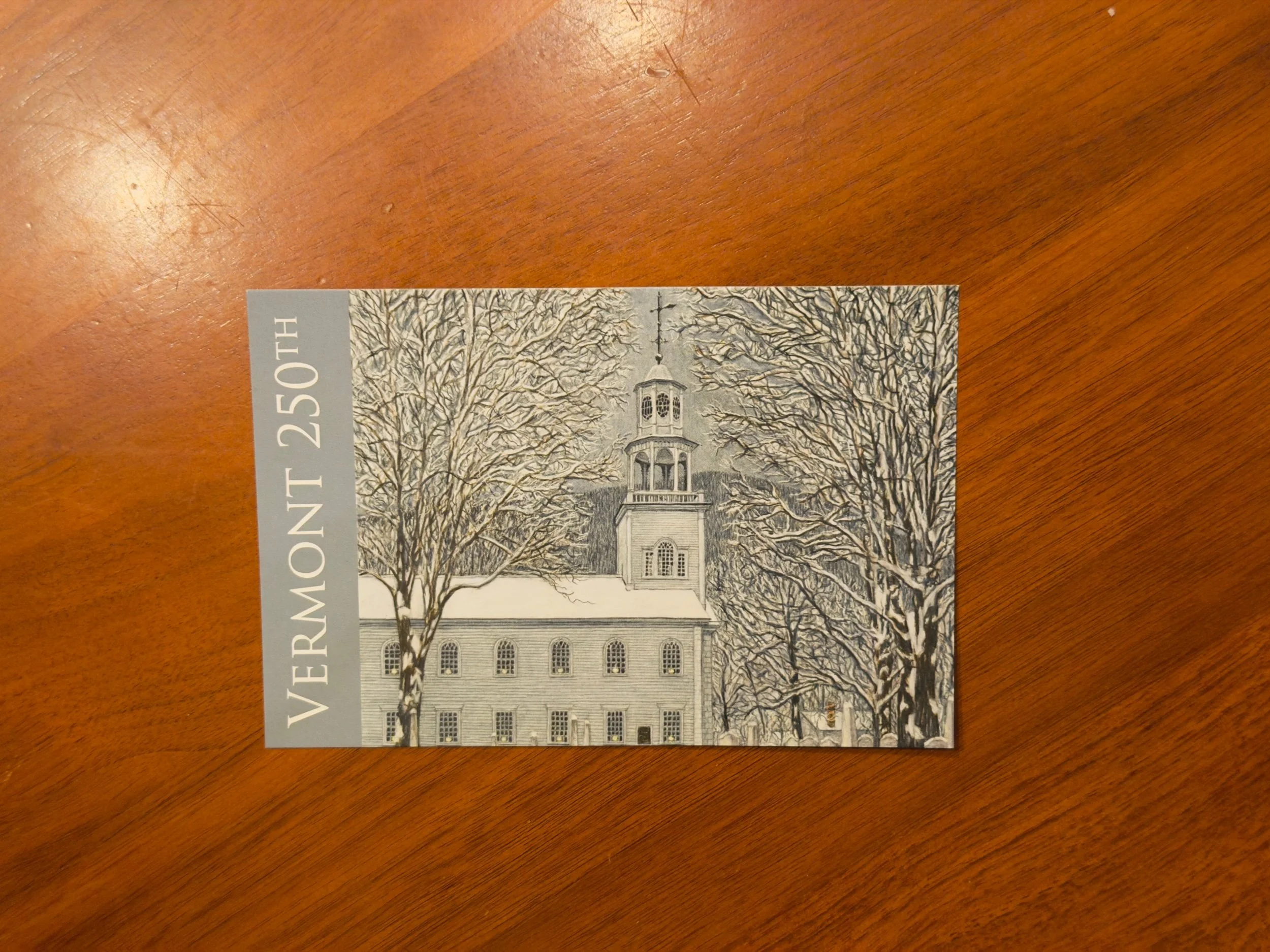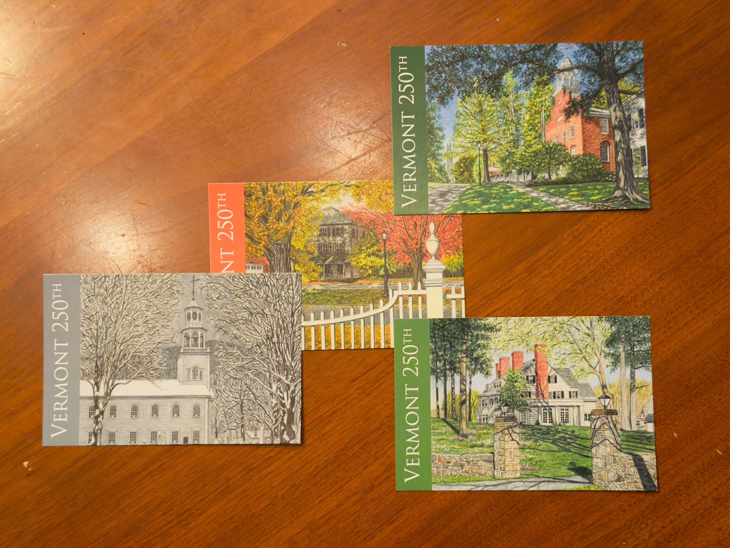 This is your chance to own a collection of 4 post cards celebrating the Vermont 250th! The artwork has been created by Bennington artist, Jim Thatch! A great way to honor the seasons of Vermont and historical buildings all found in Old Bennington.